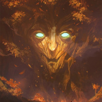The image shows a fantasy-themed illustration depicting a tree with a human-like face. The tree is located in a forested area, and there's