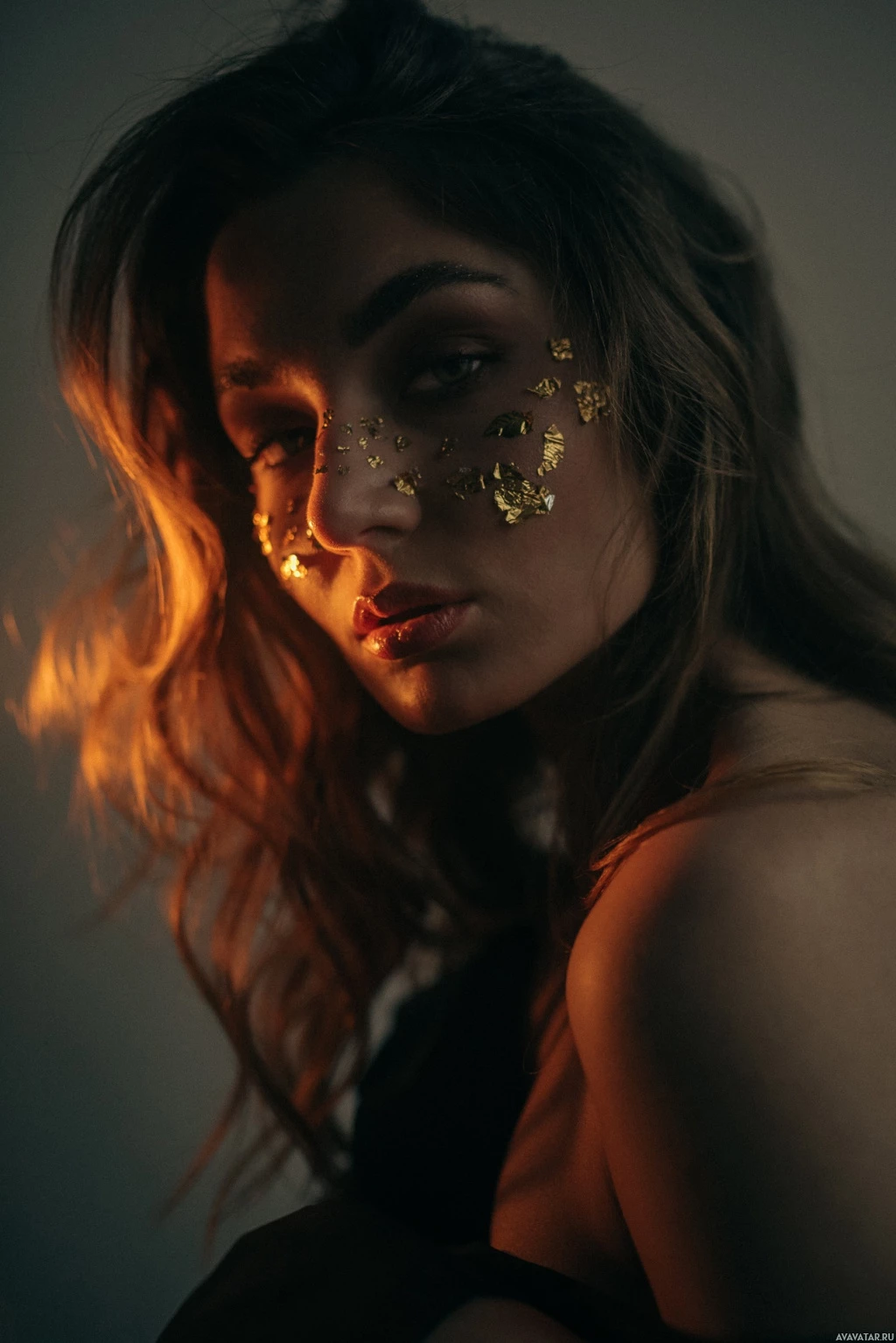 The image shows a woman with her hair styled in loose waves. She is wearing gold eye makeup, which gives an ethereal and mystical vibe to the photo. Her expression appears to be contemplative or intense. The background has a warm tone that complements the overall mood of the image.