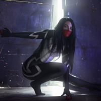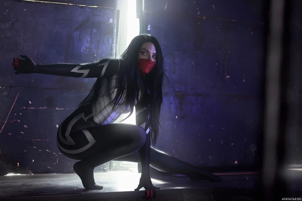 a cosplay outfit, representing the character Silk from Spider-Man. The costume is detailed with a suit and mask that are typical of Silk's appearance in the comics and movies. The individual is posed in