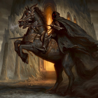 dark armor and a hood, which gives the impression of being a figure from Middle-earth, possibly a Nazgûl due to the context provided. The background suggests