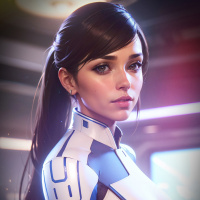 a female character in what appears to be a video game setting, possibly from the "Mass Effect" series. She has long