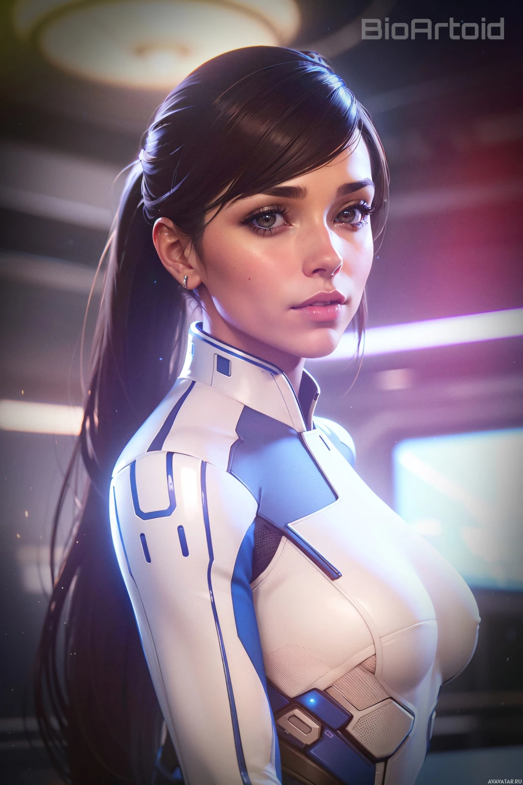 brown hair tied into a ponytail and is wearing a white and blue armor with a helmet that looks like it has visor-like headgear. Her expression is neutral, and she's looking slightly to her right. The background suggests a futuristic or sci-fi environment with