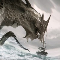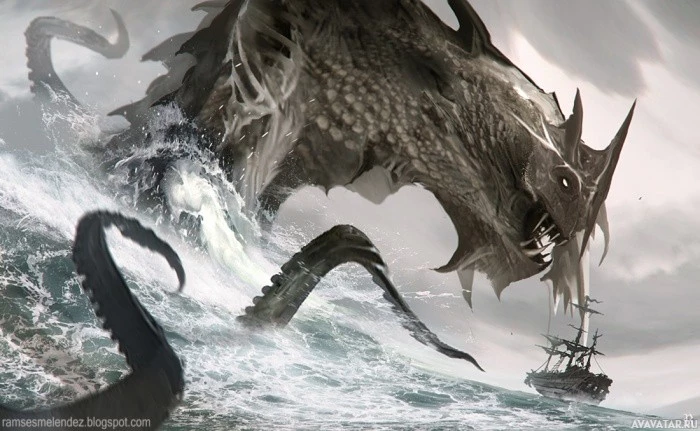 a fantasy scene of a monster rising from the ocean, attacking a ship. This creature appears to be a blend of various sea creatures such as a shark and an octopus, with