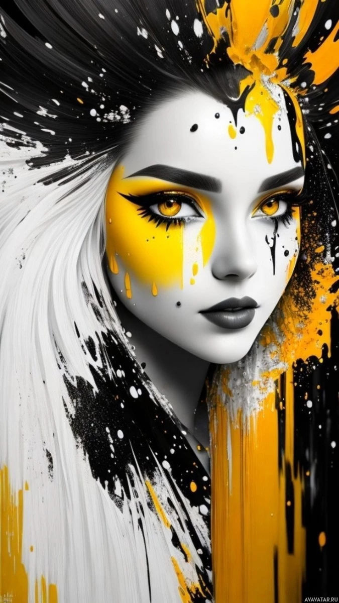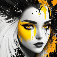 striking makeup and hair that are colored yellow. They have dramatic, colorful eyeshadow and are adorned with what appears to be paint or splatters in various