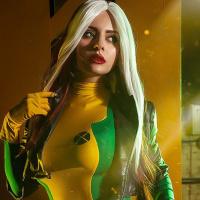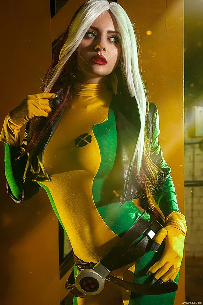 На картинке изображен человек, одетый в костюм Роуга, персонажа из серии комиксов "Люди Икс". Это пример косплея, когда люди переодеваются в персонажей книг, фильмов или других средств массовой информации для развлечения или на таких мероприятиях, как конвенции.