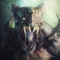 The image depicts a creature that resembles a monster, characterized by an aggressive expression with visible teeth and