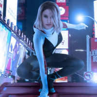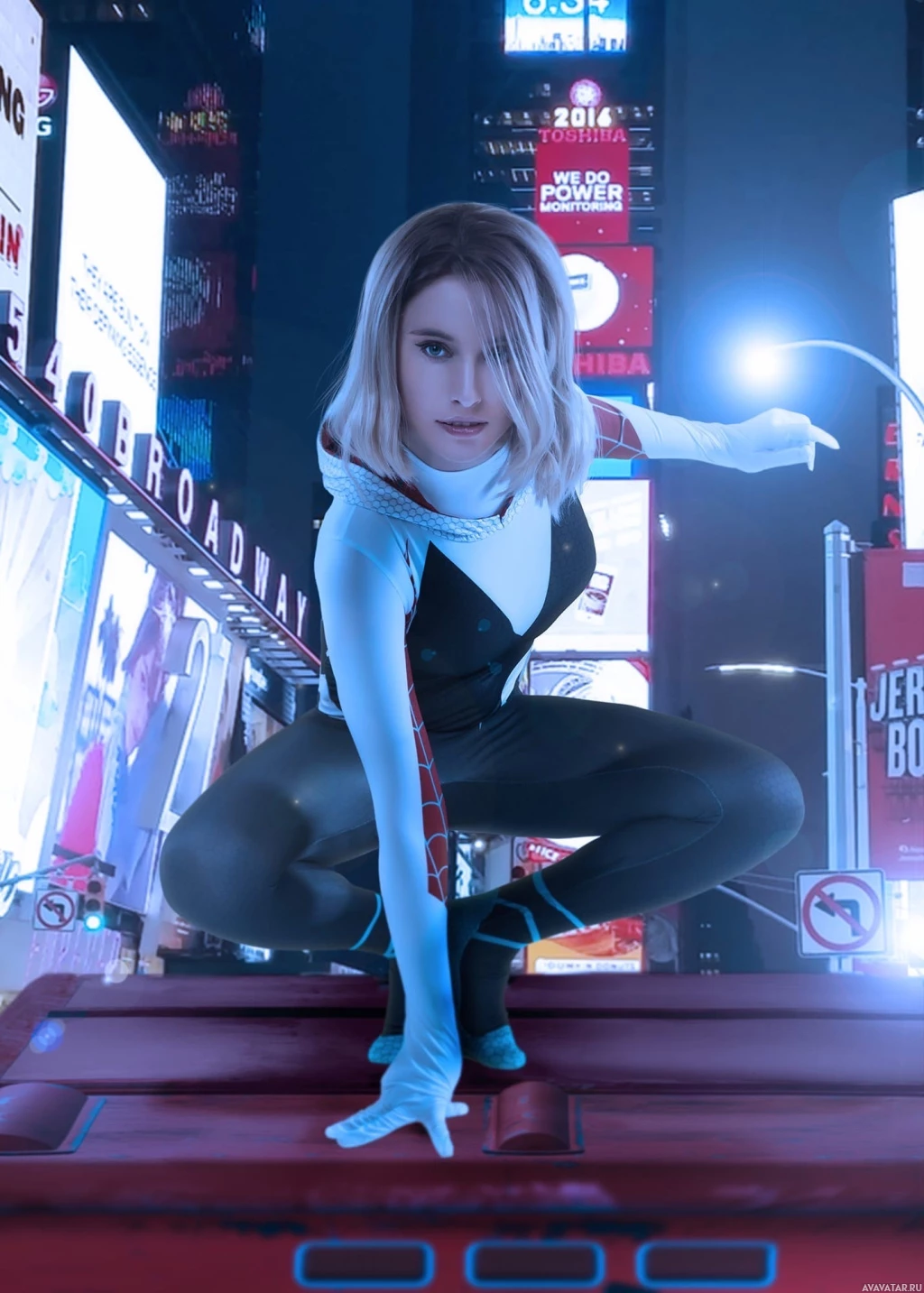 a video game, portrayed in an urban setting that appears to be inspired by New York City's Times Square. She is wearing a costume with a blend of elements typically associated with the Spider-Man series, which include a black and white suit with spider emblems, as well as some design details reminiscent of the classic Spider-Girl outfit from