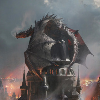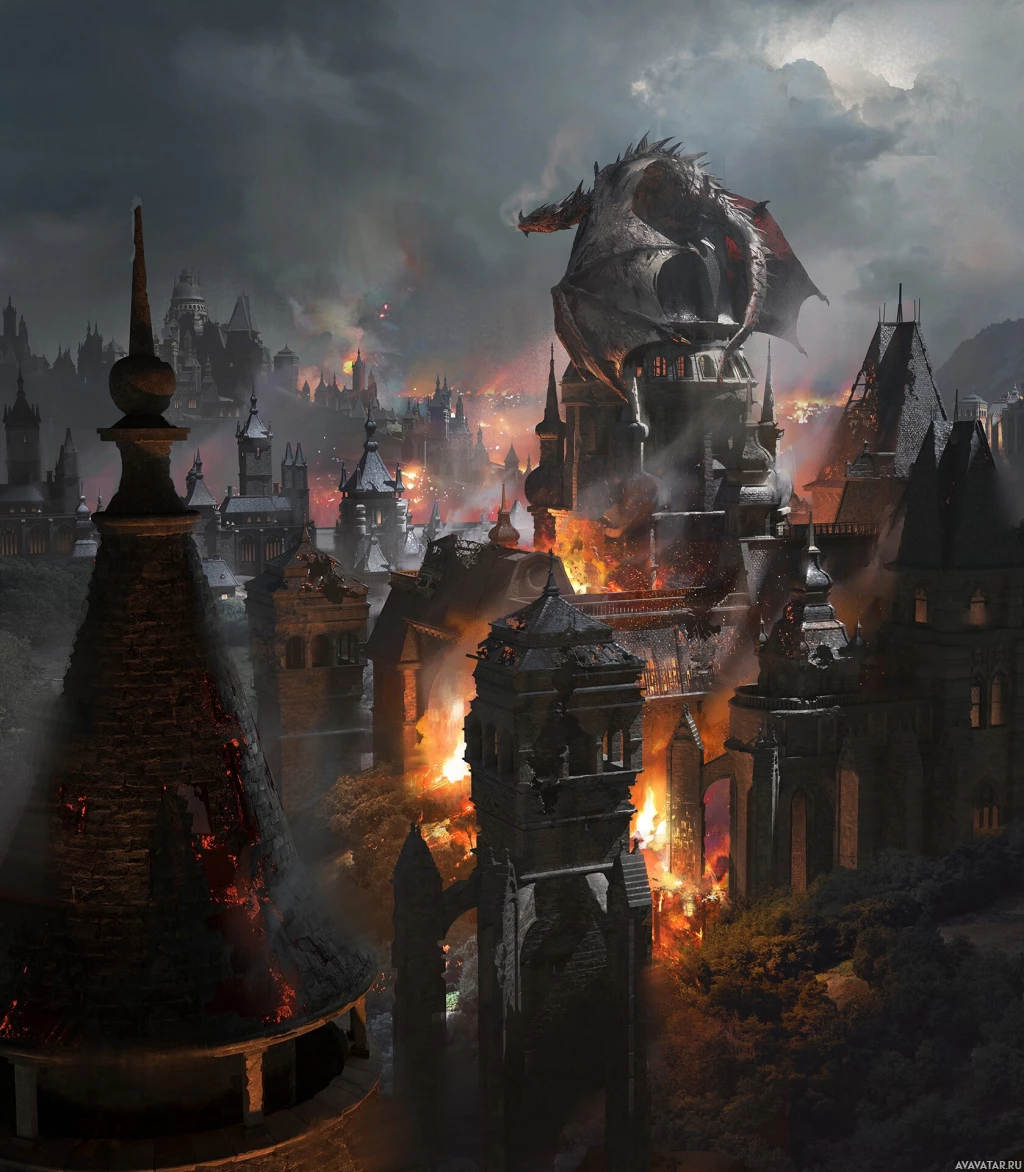 parts of the buildings are engulfed in fire. The setting is dark and cloudy, enhancing the chaotic and dramatic atmosphere of the scene. The overall mood conveyed by the image is one of danger and destruction, with the dragon being the central threat to the city's safety. The architecture suggests a European style reminiscent of medieval times, which could be part of a fantasy genre narrative.