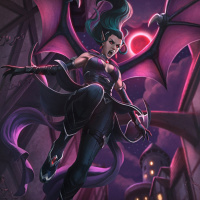the red eyes and bat-like wings. This character is wearing dark clothing with red accents and has