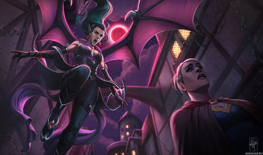 a fantasy scene with two characters. On the left side, there is a character that seems to be a vampire or demonic entity due to