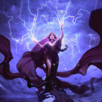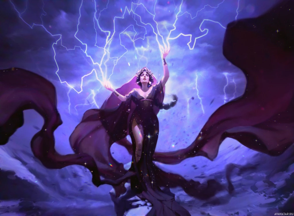 dark clouds and lightning bolts that illuminate her figure dramatically. Her attire suggests she might be a sorceress or witch, with