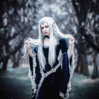 a natural setting with trees around them, which could suggest they are portraying a character in a mythical forest or similar environment.