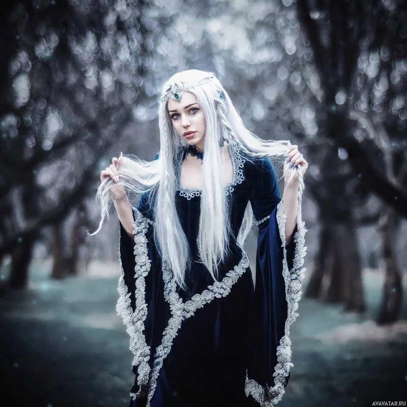 white hair and is wearing a long dress with intricate details. They appear to be standing in