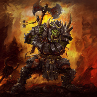 a volcanic eruption or some kind of fiery pit, and it's holding a large axe with both hands, ready for combat. The character is wearing armor, which includes spikes and appears to be of a dark or
