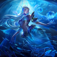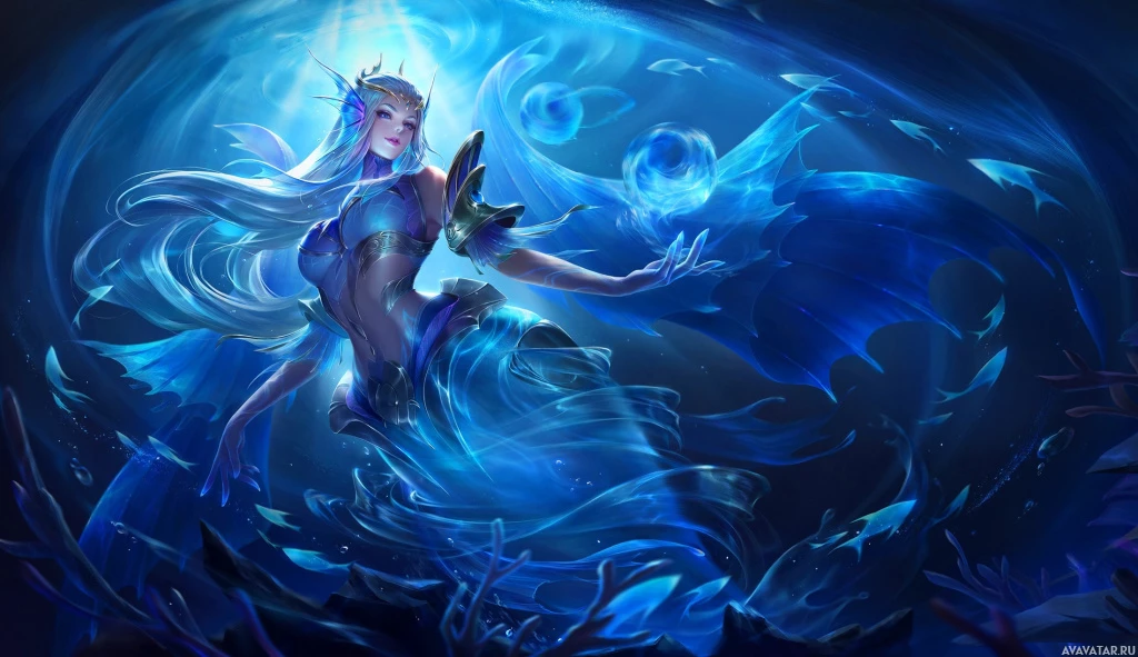 blue hair and is depicted in a pose that suggests she's swimming or surfacing from water. She is wearing an ornate, aquatic-inspired outfit with elements that resemble scales or