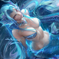 blue hair and scales resembling those of a fish, with an upper body that appears to be human-like. She is depicted with