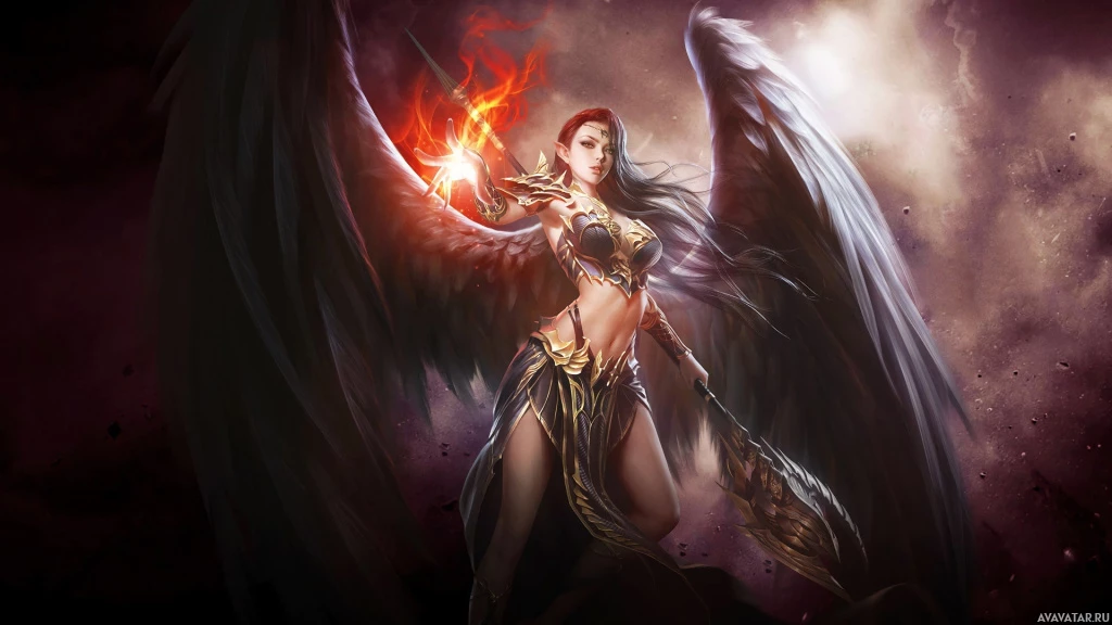 mythical creature. The character has large wings, which are common attributes for angels in various mythologies and