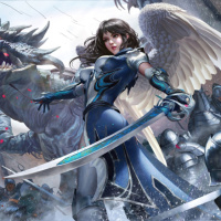 a dynamic pose, with wings spread wide and a sword in hand, suggesting action or combat. The artwork is detailed and colorful, depicting a scene that evokes