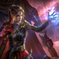 a red cape draped over one shoulder and she's also holding a staff with a glowing blue crystal on top, which suggests the presence of magic in the scene. She has