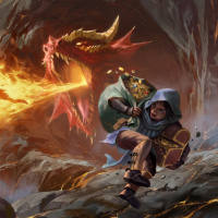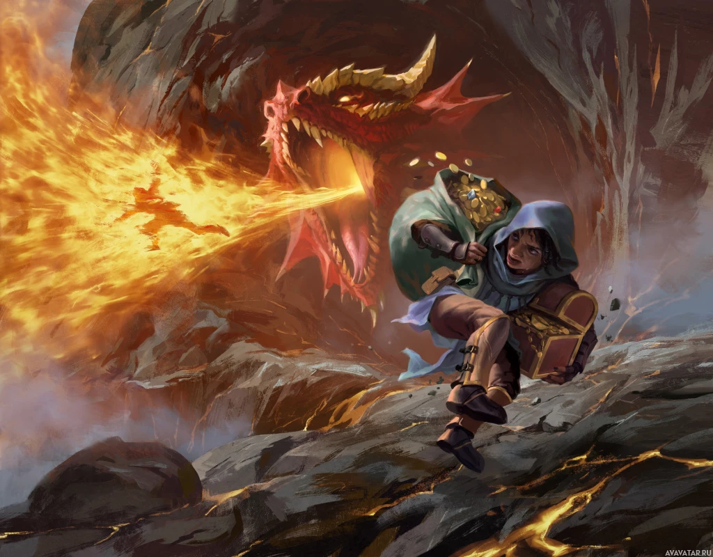 На этом изображении изображена фантастическая сцена с участием персонажа, который похож на эльфа или хоббита из-за своей одежды и позы. Персонаж держит в руках что-то похожее на посох и произносит заклинание против большого дракона, который дышит в их сторону огнем. Обстановка кажется драматичной, на заднем плане видны вулканические образования и языки пламени, что наводит на мысль о сцене из эпической фантастической истории или видеоигры.