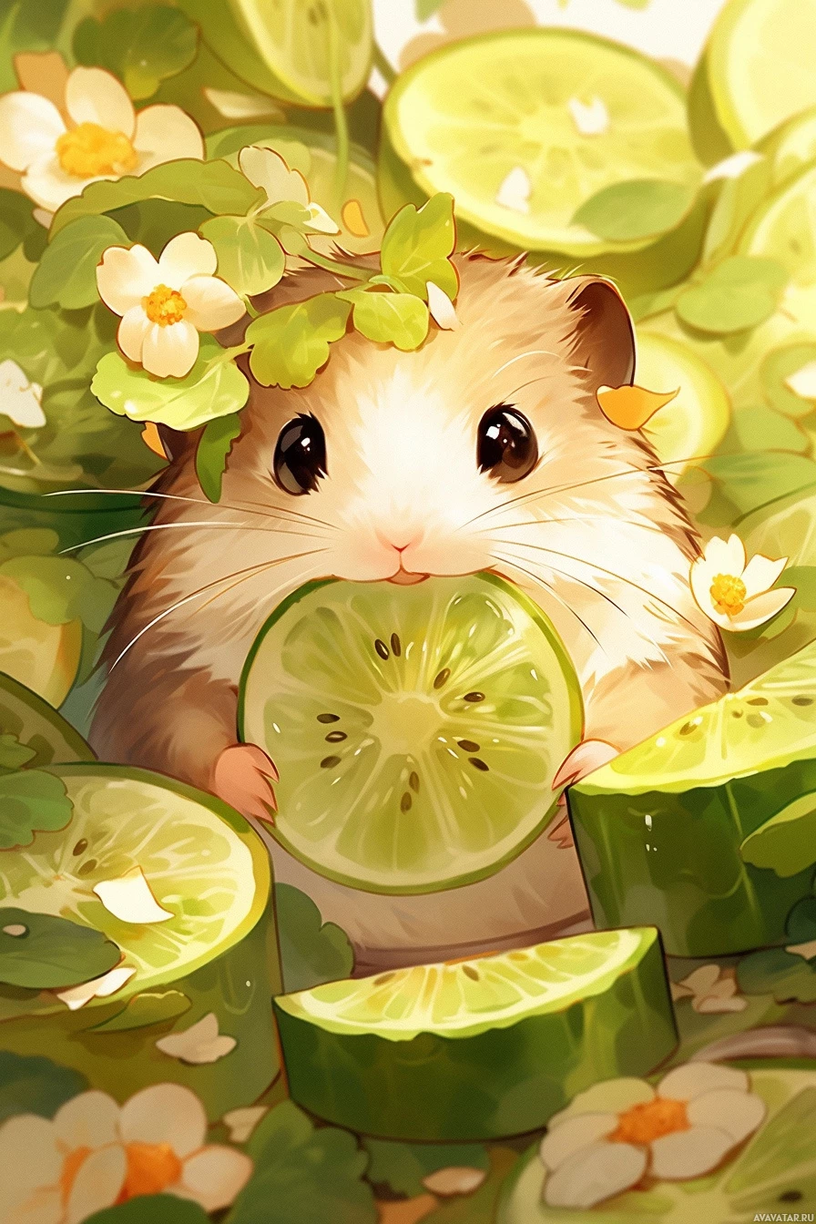 The image features an adorable humster character surrounded by limes and other fruits. It appears to be a whimsical or fantasy-themed illustration, as the humster is anthropomorphized with human-like features like eyes,