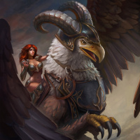 red hair riding atop a griffon, which is a mythical creature resembling a lion or bird of prey. The girl appears to be dressed in armor and holding onto the griffon's neck, indicating a sense of adventure or warrior-like spirit. The background suggests an epic, possibly battle-related setting, with dramatic skies that contribute to
