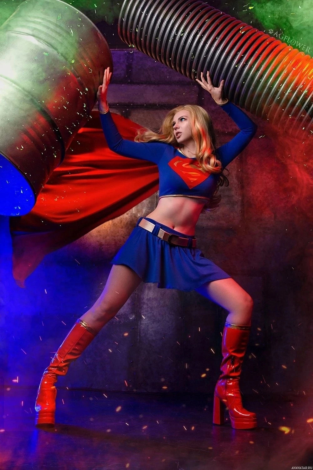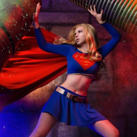 a Supergirl costume. They are standing against a backdrop that includes a giant spring, which adds to the dynamic and energetic theme of the scene. The costume is detailed with recognizable elements like