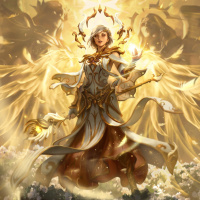 ornate clothing, suggesting a divine or spiritual status. They are holding what appears to be a staff or wand, which might indicate some kind of magical or supernatural power associated with them. Surrounding the character are ethereal flames and