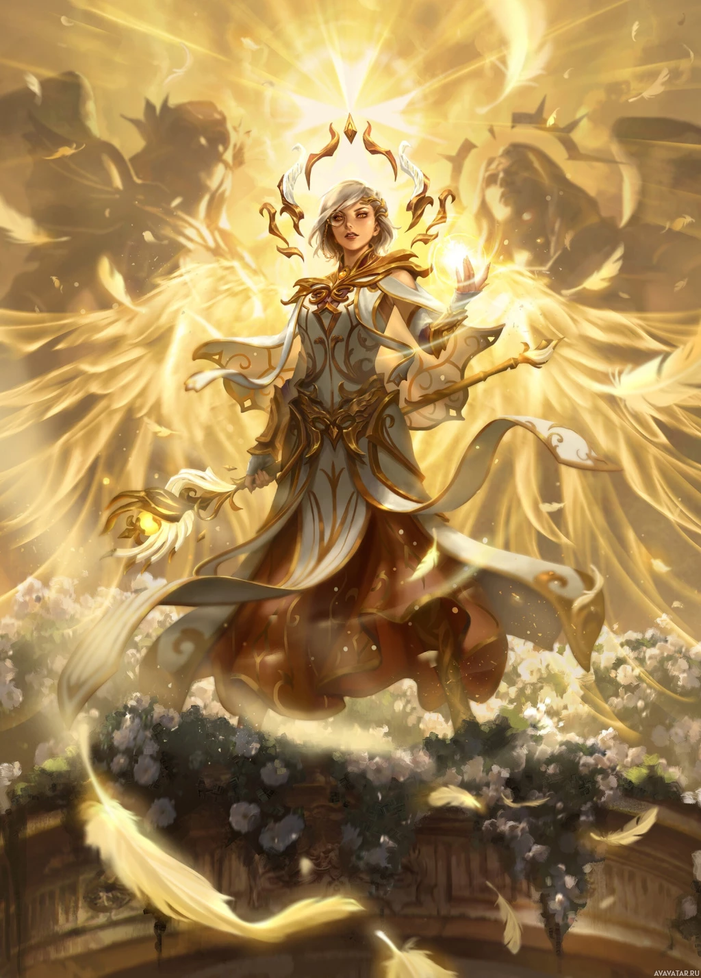 The image depicts a fantasy-themed illustration of an angelic figure with