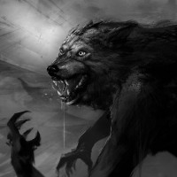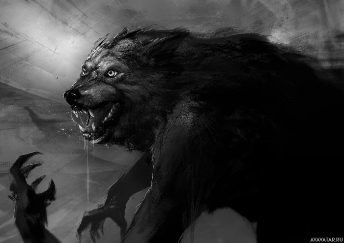 Картинка показывает фантастическое существо, которое является оборотнем. Он имеет мышечную структуру, острые зубы и демонстрирует агрессивную позу с открытым ртом и расширенными когтями. Картина передает ощущение сырой силы и интенсивности, связанные с мифическим существом, обычно встречающимся в фольклоре и жанрах фэнтези.
