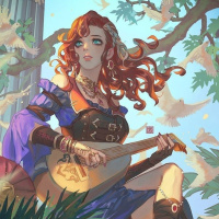 red hair, which is flowing to the side, and she appears to be playing a guitar. She's wearing some sort of medieval or fantasy-inspired clothing that suggests she might be a bard or musician from a story or game set in a different time period. The character is depicted in a serene and somewhat ethereal manner, which could suggest that she has