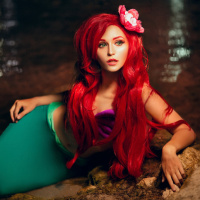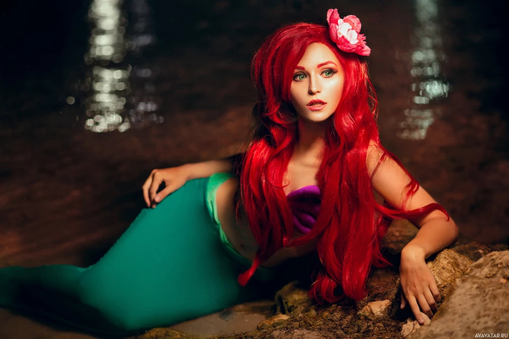 The image shows a person cosplaying as Ariel, the character from the Disney film "The