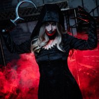 a black outfit with red accents, which includes what appears to be a mask or face paint with darkened eyes and blood-red lipstick, giving her an ominous look. In her right hand, she holds what seems to be a weapon, possibly from the game itself. The background is dimly lit with a reddish hue, contributing to the moody atmosphere often associated with horror games like "