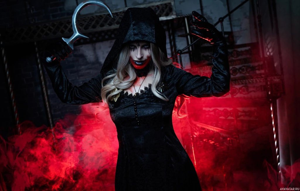 The image features a woman dressed in a costume that resembles a character from the "Resident Evil" video