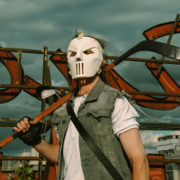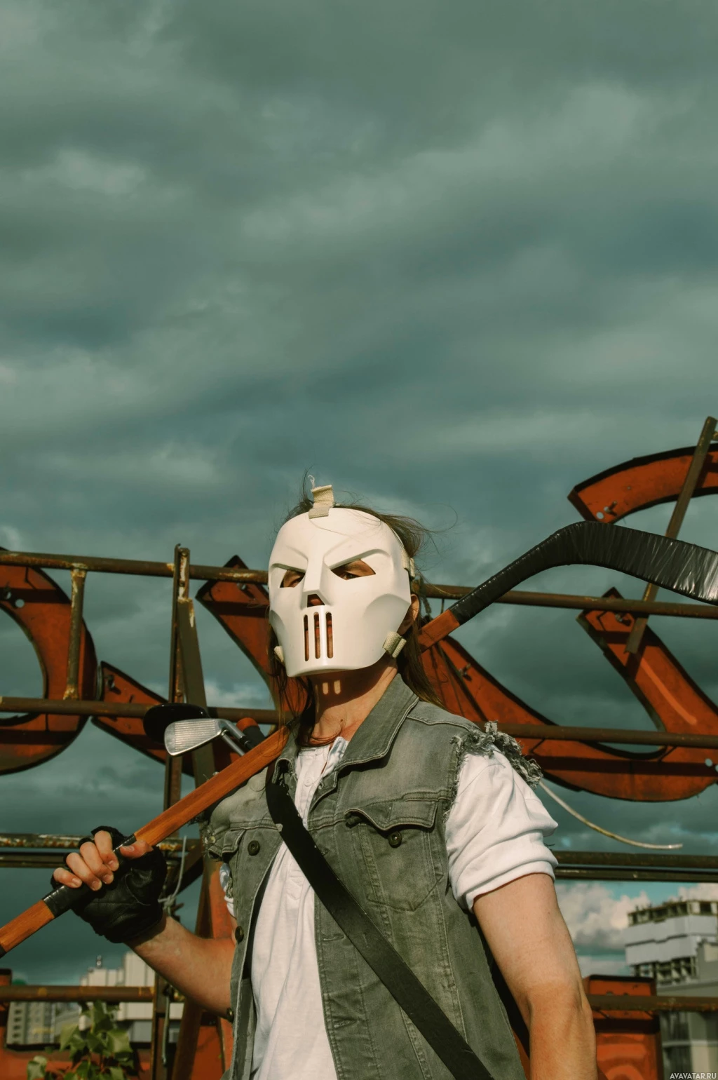The image shows a person dressed in a costume that resembles Casey Jones, a character from