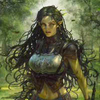 green skin with moss and foliage elements, suggesting she is made of wood or plant matter. Her hair seems to blend into