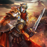 a heroic pose with a stern expression, possibly preparing for battle. The setting suggests a dramatic scene, which could be from