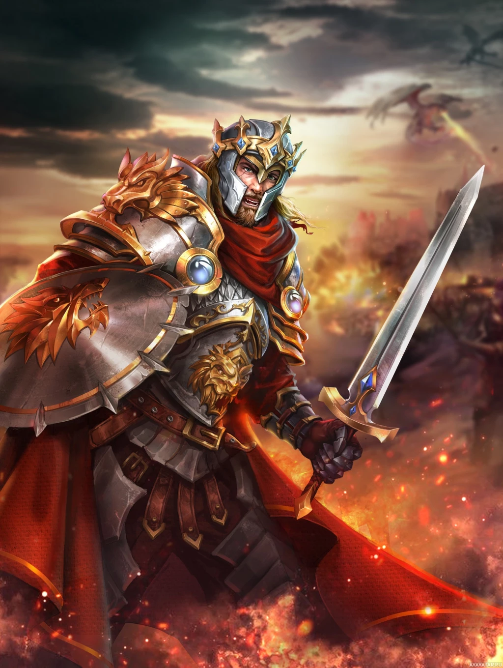 The image features a character who appears to be a warrior or a knight, as indicated by the sword and armor. This character is depicted in