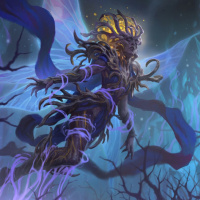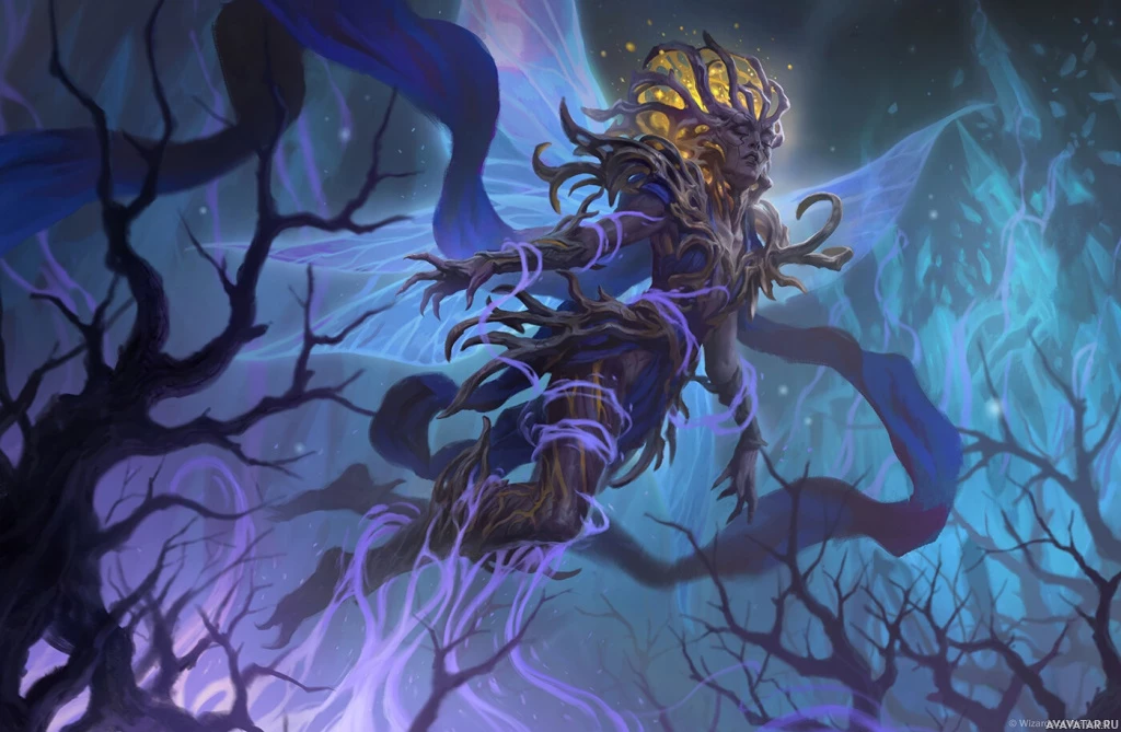 an elaborate costume or armor that includes elements of nature and mysticism, such as leaves and branches. The character is also wearing a headdress or crown with intricate details, possibly indicating royalty or
