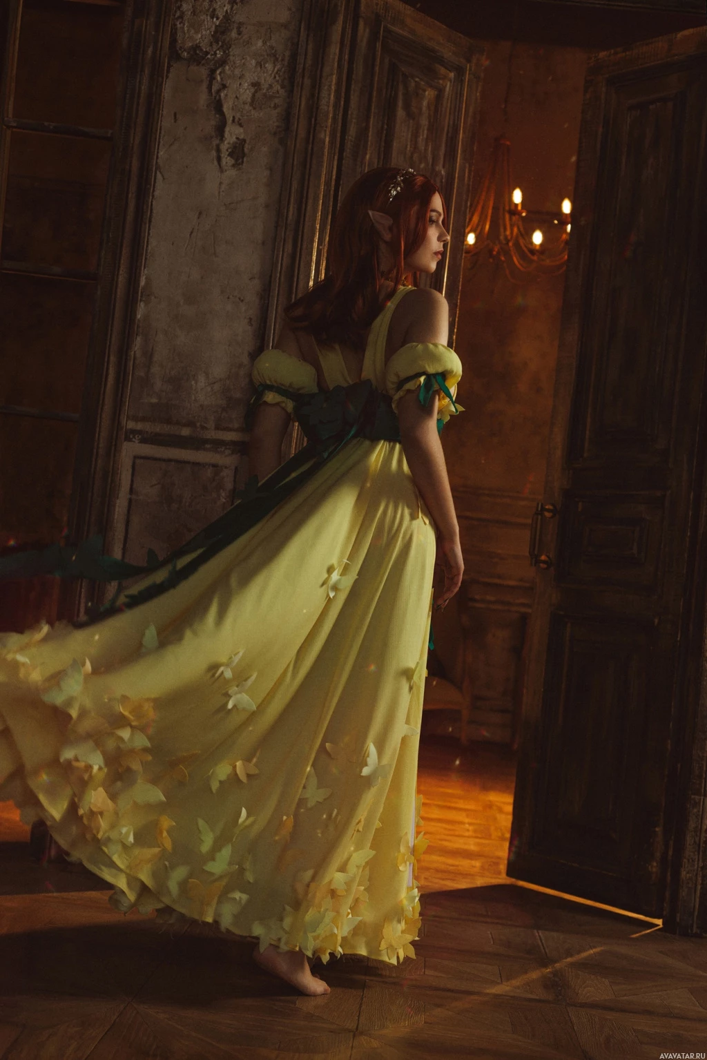 red hair and is wearing a yellow dress with intricate leaf patterns on it. They are standing in a dimly