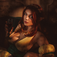 red hair and is wearing a dress that appears to be made of leather with gold trim. In her right hand, she holds a goblet, suggesting that she may be role-playing as