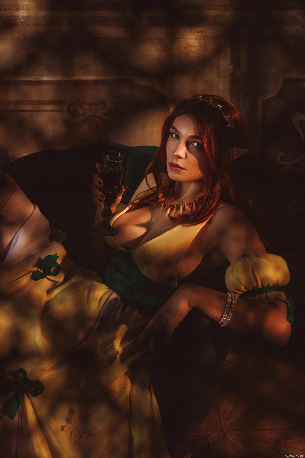 The image depicts a woman dressed in a costume that resembles an elven outfit from
