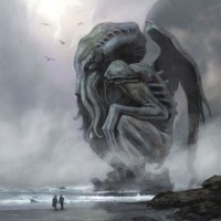 a sense of dread or mystery, which is often associated with Lovecraftian horror. There are also smaller figures of people at the base of the monster, looking up in awe or possibly terror, emphasizing the scale and menacing