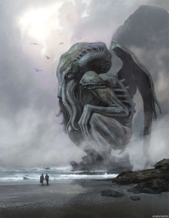 a fantasy scene with the Cthulhu monster, which is a fictional deity created by H. P. Lovecraft and featured in his works. In this illustration, the Cthulhu figure appears as an immense creature with tentacles and a humanoid body form emerging from