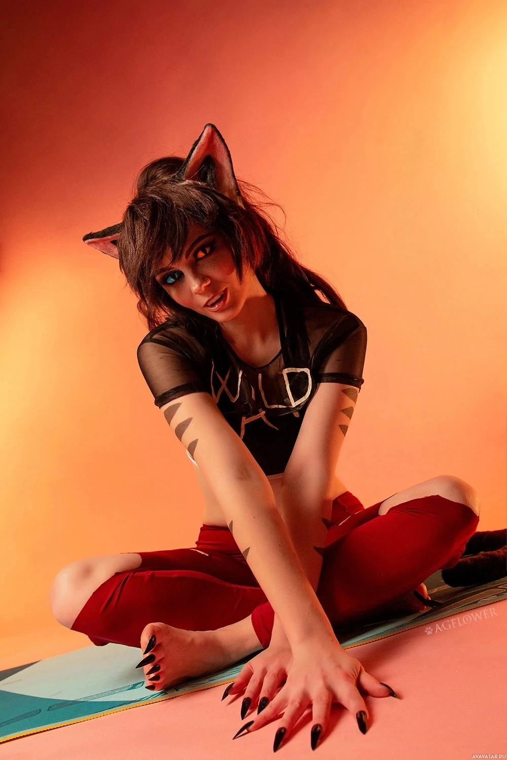 cat ears on their head and possibly other feline-themed accessories or clothing. The individual is sitting in a pose reminiscent of someone who might be imitating a cat's behavior. Cosplay, which this image represents, is the practice of dressing up as a character from a book, movie, comic, animation,