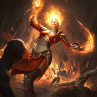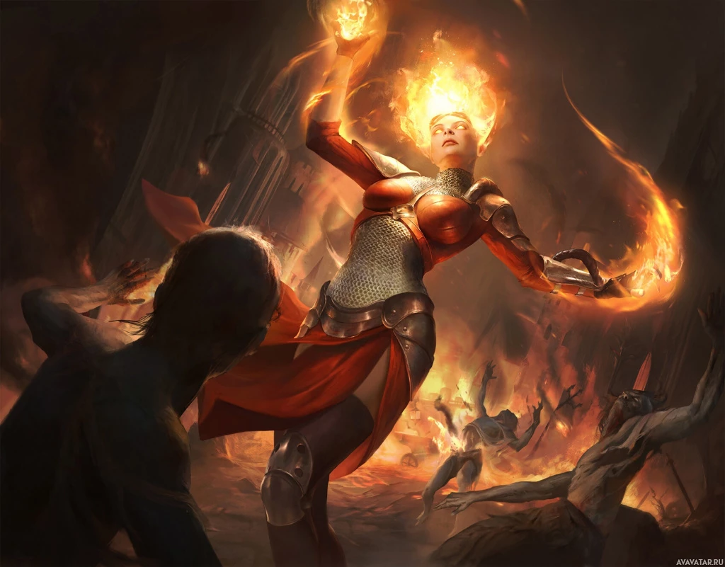 a fantasy scene featuring a woman in the center who appears to be casting fireballs. She is wearing a red and gold armor with flames on her shoulders, suggesting she may have powers related to fire or magic. To her right, there's another figure that seems to be either an ally or an opponent, depending on the context of the story. The setting looks like a battlefield or