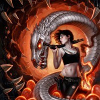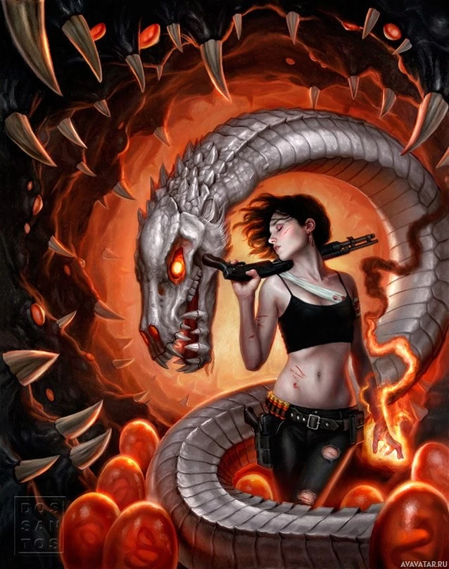 an illustrated scene featuring a woman, who appears to be holding a gun pointed at a large serpent or dragon. The dragon has