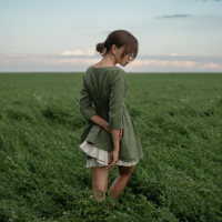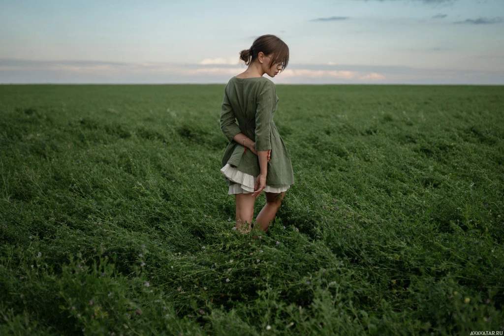 leisure time outdoors. Her pose is relaxed with one hand resting on her hip. Behind her, there are expansive grassy fields that stretch to the horizon, providing