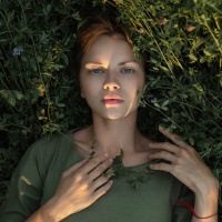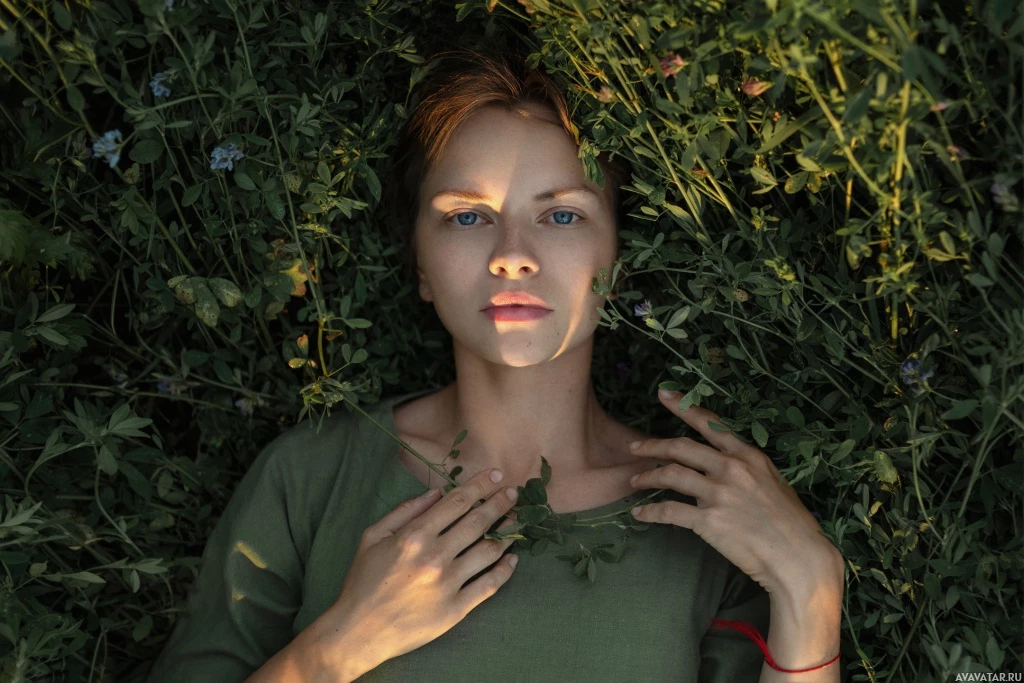 green vegetation. She appears to be resting with her arms slightly raised and her hands clasped together. The lighting suggests it could be either dawn or dusk due to