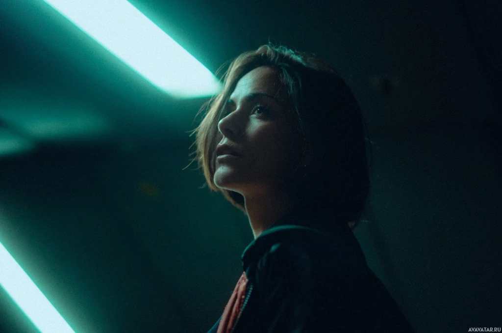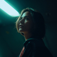 a young woman or girl, with short hair and a neutral expression. She is looking to the side and has a contemplative or serious demeanor. The lighting in the photo appears to be dim or low, with a greenish hue, which could suggest